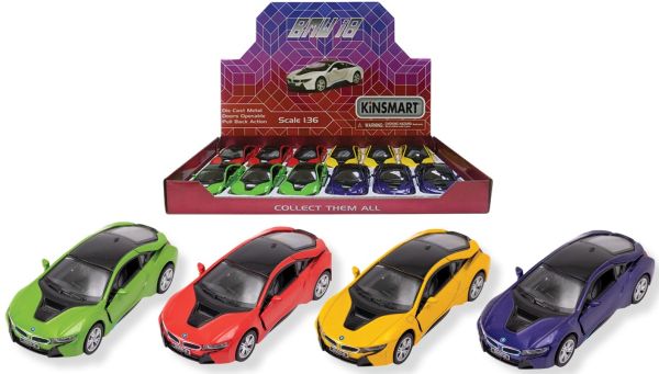 KINSMART – BMW i8 – Modellino cm12 c/porte apribili – c/pull-back and go In espo da 12pz (39x28cm) 4ass…x12…x48