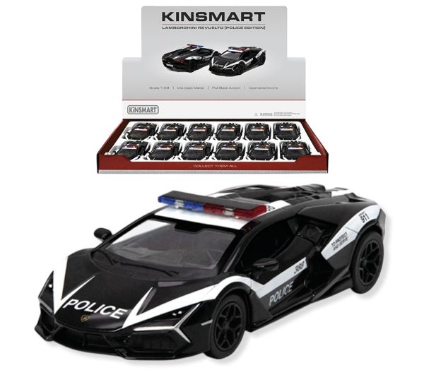 KINSMART – Lamborghini Revuelto (Police Edition) – Modellino cm12 c/porte apribili – c/pull-back and go In espo da 12pz (42x28cm)…x12…x48